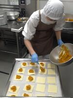 手作りルウのホワイトソースは、人気があります。ホワイトルウは、同量のバターと小麦粉を20分程炒めて作ります。粉っぽさを残さないように、こがさないように、絶妙な火加減で、なめらかなペースト状のルウができました。