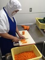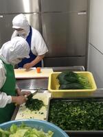 今日は、手作りの春巻きなので、いつもより早い時間に八百屋さんから野菜を受け取り、具を炒め、並行して皮を一枚ずつはがします。準備が整ったら、巻いて巻いて・・・・揚げて揚げて・・・。パリッと揚がった春巻きは、児童にも職員にも好評でした。