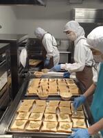 今日の麦のリゾットスープには、豆乳バターと植物性のチーズを使い、乳アレルギーの児童も同じものを皆で食べられるようにしました。プリっとした麦も加わり、いつもとは一味違ったスープに仕上がりました。