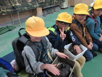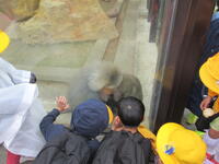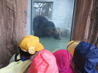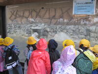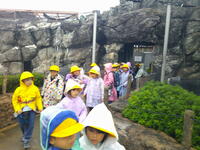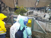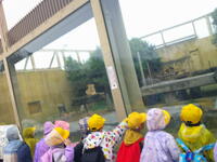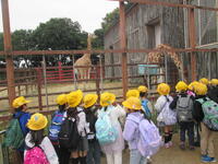 ふれあい体験の後は、各学級に分かれて1時間ほど見学をしました。雨が降ってきたので、かっぱを着用して見学しました。子ども達は興味津々でたくさんの動物を見学しました。