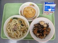 献立:ごまうどん・ひじきと生揚げの煮物・米粉のりんごケーキ・牛乳