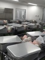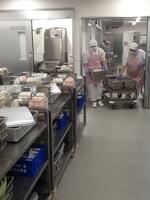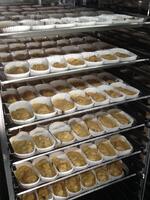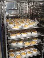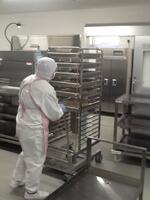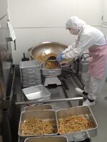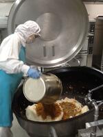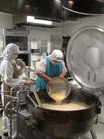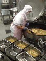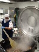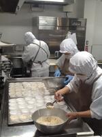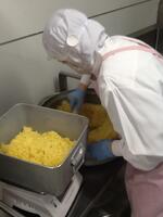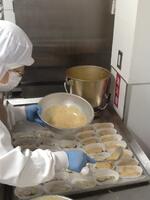 米粉のりんごケーキには、缶詰のりんごと生のりんごを使います。材料を全て合わせると、40kg以上になりました。カップの大きさは、全学年同じですが、流し込む量を学年に応じで変え差をつけます。焼き上がって粗熱を取ると、米粉ならではのしっとりもっちりとした生地に、りんごの香りと甘み、酸味がよく合い、おいしく仕上がりました。