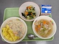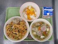 献立:キンパ風混ぜごはん・蒸ししゅうまい・青ねぎスープ・フルーツ豆乳デザート・牛乳