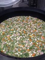 キンパとは、韓国の代表的なのり巻き料理のことです。ごま油で炒めた具には、たくあんやキムチが入り甘めの味付けです。今日の一番人気は、このキンパ風混ぜごはんでした。