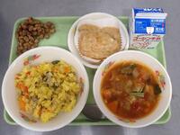 献立:チキンピラフ・たらのみそマヨネーズ焼き・レンズ豆とトマトのスープ・黒糖大豆・牛乳