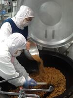 黒糖大豆は、黒糖と少しの水を加熱したところに炒り大豆を入れて、水分を飛ばしながら手早くひたすら混ぜます。これが結構重労働。息を切らしながら、混ぜてくださいました。水分が無くなり、パラッとしたらできあがりです。おいしくいただきました。