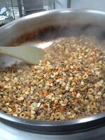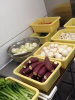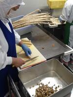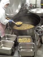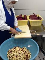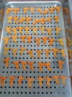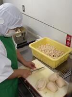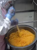 キャロットピラフは、米を炊くときににんじんジュースを使います。ほんのり甘いきれいなにんじん色のごはんが炊けました。また、チーバくんシチューにはひとクラスに2,3個のチーバくんにんじんを入れました。教室では、全部のチーバくんを見つけようと、注意深く頑張って食べている姿がありました。