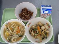 献立:チゲうどん・生揚げの中華煮・かみかみナッツごぼう・牛乳