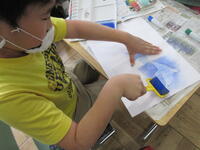 2年生は、絵の具を付けたローラーで絵を描いています。透明シートを好きな生き物の形に切って、上からローラーをコロコロ転がします。どの子も、夢中になって、作品作りに取り組んでいました。どんな作品ができあがるでしょうか?楽しみです。