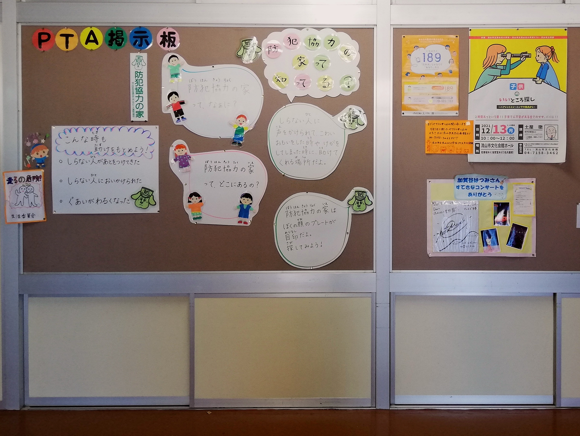 2・3年生の下駄箱のそば、入ってすぐの所に、PTAの掲示板があります。