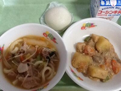 今日の給食は、チゲなべうどん じゃがいものそぼろ煮 あんまん 牛乳 でした。
