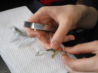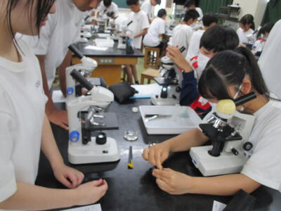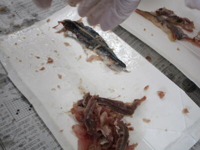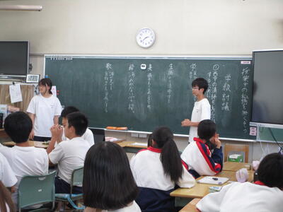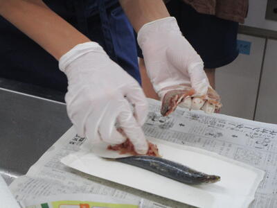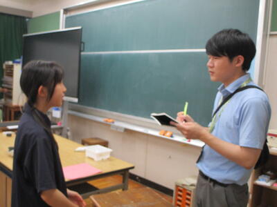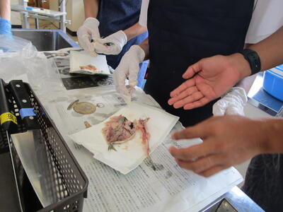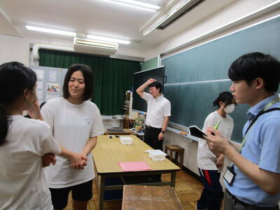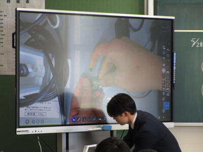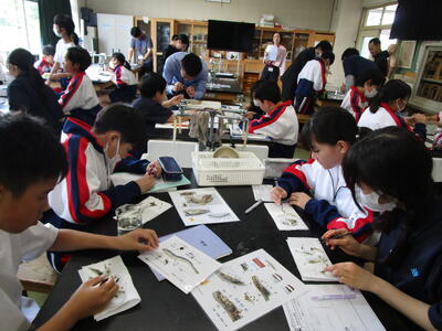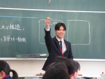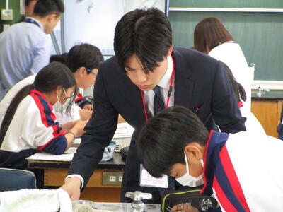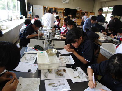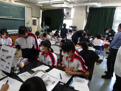 5月28日(水)4校時 1年4組で授業研修を実施しました。3週間の実習期間がもうすぐ終了するこの時期に、まとめの授業研修です。今日の学習は、脊椎動物とはどのようなからだの作りをしているかというテーマで、カタクチイワシの煮干しを解剖して確かめる授業でした生徒も実習生も、生き生きと授業に取り組んでいました