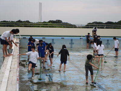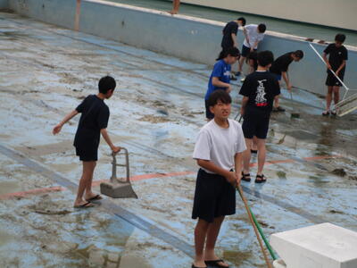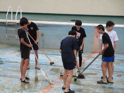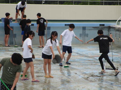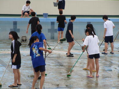 放課後に西中「貢献隊」によるプール清掃を実施しました貢献隊とは、西中生徒によるボランティア活動で、今日と明日の2日間で、プール清掃に取り組んでいます