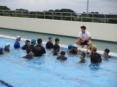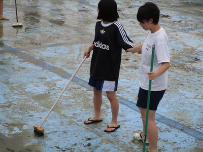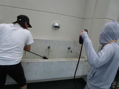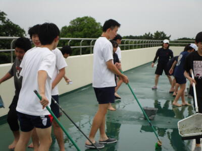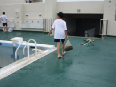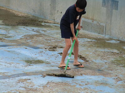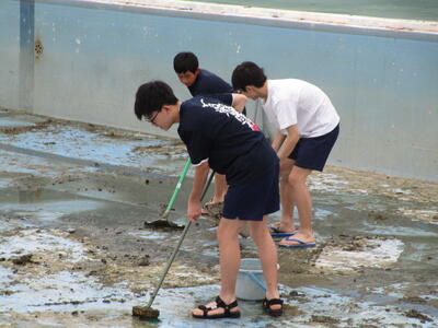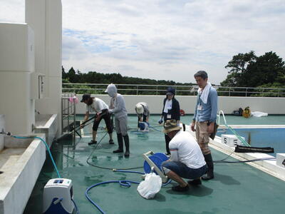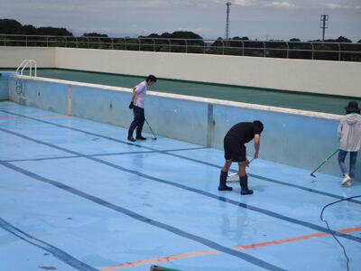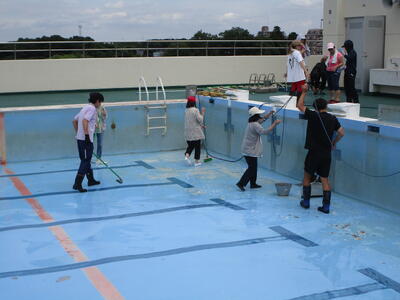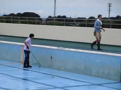 プールの底に溜まった泥を掻き出し、屋上のプールからグラウンドの穴に運んだり、プールサイドを清掃したりしました貢献隊のおかげで、きれいなプールに仕上がってきました