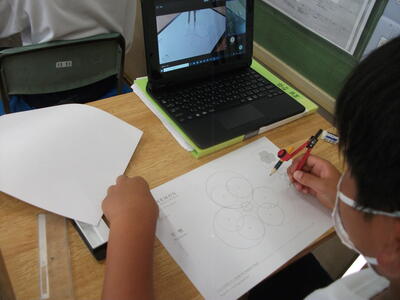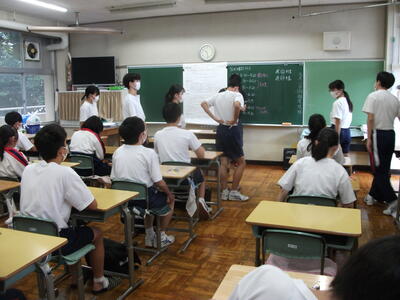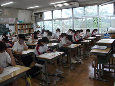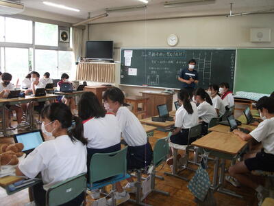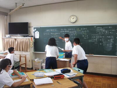 2年生の6時間目の授業です。社会の授業では、中部地方の学習のまとめで、県当て問題を行っていました。担当の瀧先生がテレビに写した写真を見て、何県かを考えて答えていました。また、美術の授業では、タブレットに映し出された動画を見て、コンパスを使いながら、日本の模様を描く学習でした。国語の授業では、夏休みの宿題の説明です。担当の川上先生がたくさんの作品の募集について説明していましたが、子ども達はメモをとりながら話を聞いていました。どの教室でも興味津々に学習に取り組む様子が印象的でした。