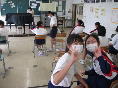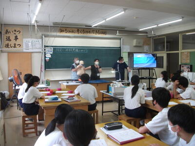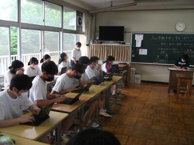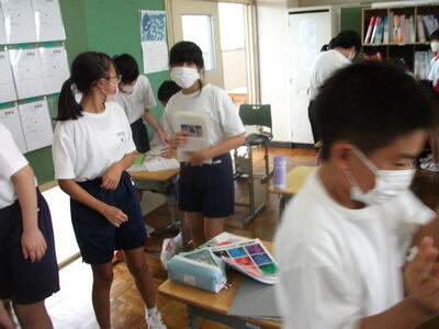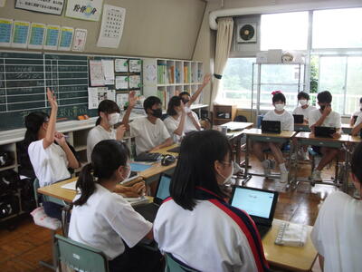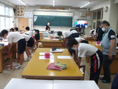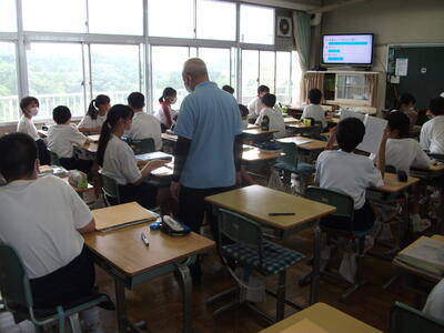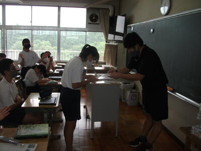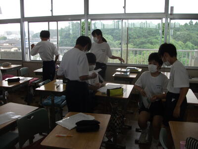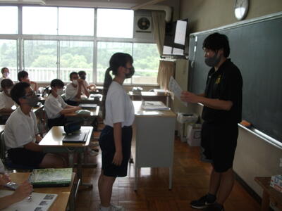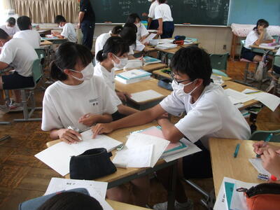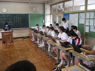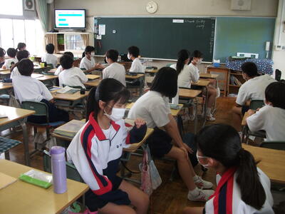 1年生は、英語の授業で、会話するペアを変えて、繰り返し質問と答えの練習をしていました。たくさんの友達に質問することで、様々な答えを聞くことができますし、質問を繰り返すことで、学習したことの定着にもつながると思います。夏休みも1学期に学んだことを繰り返して学習し、学力の向上につなげてほしいと思います。
