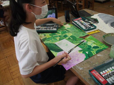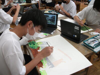 1年生の美術の授業では、自分達のタブレットで撮影した写真を使った風景画が完成間近となっているようです。鮮やかな葉や花の色を上手に表現できている絵が多いようです。もうすぐ1学期も終わりを迎えます。しっかりと仕上げて素敵な作品を完成させてほしいと思います。
