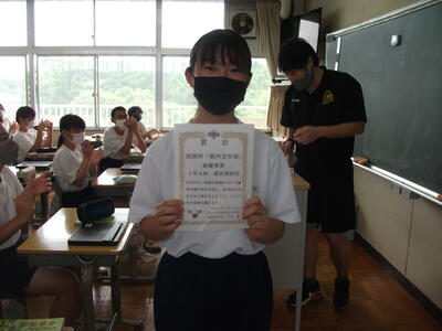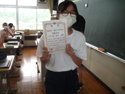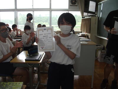 1年4組の教室からは、大きな拍手が聞こえてきました。国語の授業で、一人ひとりが、様々な内容の催し物の案内文を作り、それを担任の金子先生に読んでもらったそうです。金子先生は1週間という長い期間をかけてじっくりと読み、全ての案内文の中からベスト3を決めたそうです。教室では、その案内文を作成した3人に国語担当の石井先生から賞状が渡されていました。全員が魅力的な案内文を考えて作成したことと思いますが、その中でも特に優れた作品を作った3人はとても素晴らしいと思いました。