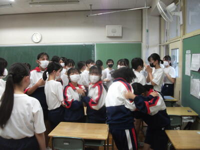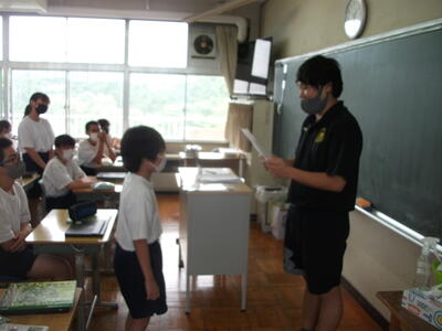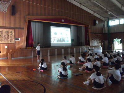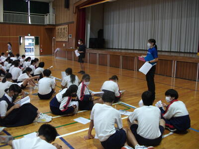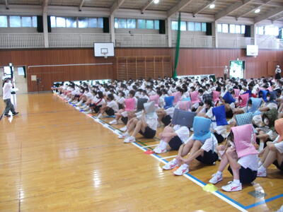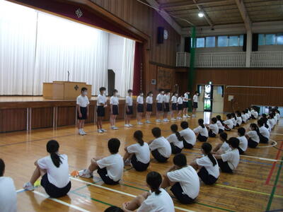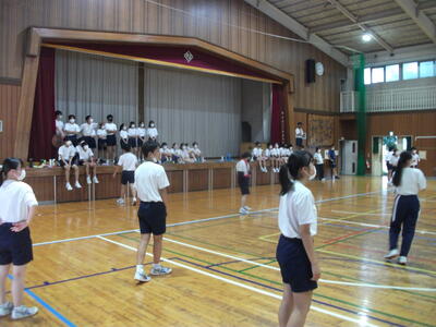 1学期も残り2日となりました。本日は4時間授業でしたが、どの学年も体育館や校庭でレクをしていました。期末テストをはじめとして、一生懸命勉強をしてきた子ども達に対して、担任の先生方からのご褒美タイムでした。雨に降られることもなく、楽しい時間を過ごしていました。また、格技場では1学期の振り返りをしていましたが、レクの時間とはがらっと雰囲気が変わり、真剣な顔つきで話をしたり、話を聞いたりしていました。本日振り返ったことを、2学期に生かしてほしいと思います。