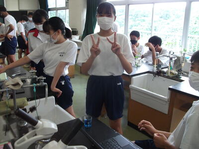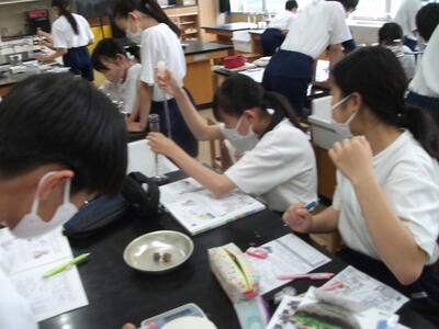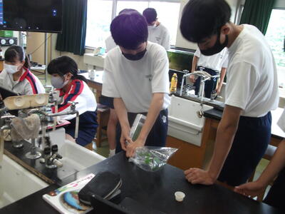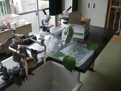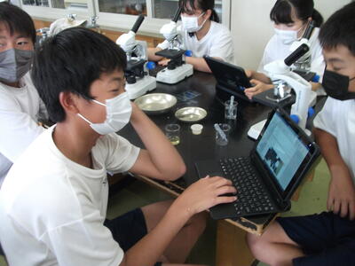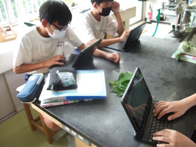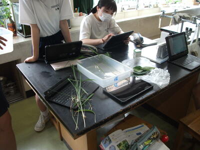 2年生の理科の授業では、植物は本当に「光合成」や「蒸散」や「呼吸」をしているのかを証明するため実験をしていました。理科室にあるもので、使えるものは全て使って良いという指示が出ており、子ども達は様々な道具を使って、それぞれを証明するための方法を考え、実験を進めていました。実際に様々な種類の葉をとってきて、実験器具を使ったり、顕微鏡を使ったり、タブレットを使ったりして、グループの中で知恵を出し合いながら活動していました。与えられた課題に対して、みんなで模索しながら、意欲的に活動している姿に感心しました。