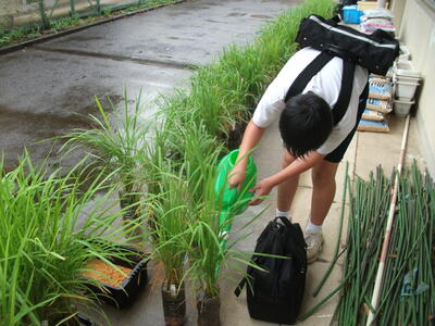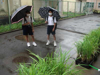 今日は朝から雨が降っていましたが、1年生が家庭科の授業で育てているペットボトル稲のある校舎の裏側に人影がありました。「土の状態が悪くなるとカビが生えてしまうそうなんです。」と言いながら水を替えていた、学年委員長の長谷川緑風くんでした。傘もささずに一生懸命にお世話をする姿が立派でした。その後も、稲の成長を見に来る子ども達もおり、関心の高さを感じました。稲は大きく育っています。