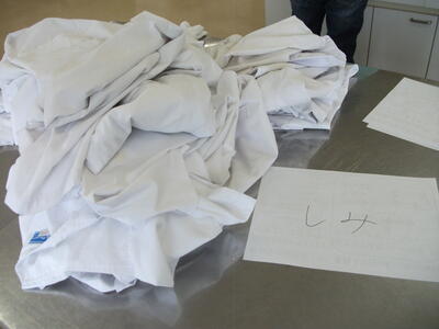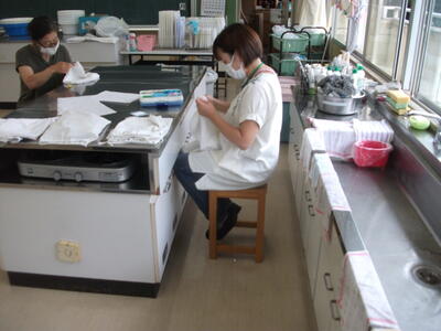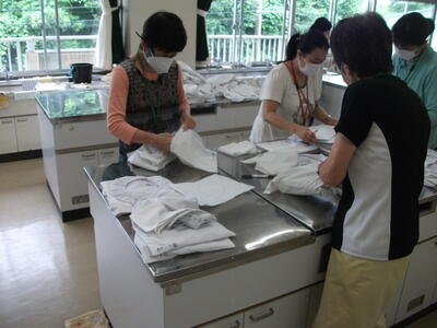 今日も、たくさんのボランティアの方々にお集まりいただき、1学期の間、子ども達が給食の配膳時に使用していた白衣を修繕してもらいました。全校分の白衣を集め、一つ一つ確認して、修繕が必要な白衣を選び、手作業で丁寧に直していただきました。明日も引き続きボランティア活動をしてくださるそうです。ありがとうございます。