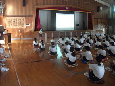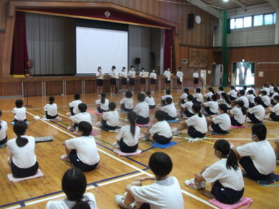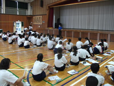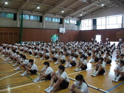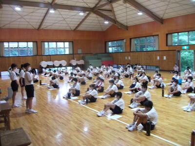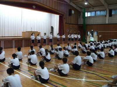 9月17日(土)には体育祭も控えている本校です。本日より、体育祭に向けての取り組みも始まりました。昼休みの体育館に、体育祭実行委員、応援団、生徒会役員が集まり、体育科の向後先生と井坂先生から説明を受けていました。来週から、朝と放課後の打ち合わせや練習、授業時間での体育祭練習も始まります。今日集まった子ども達が中心となり、立派な体育祭を作り上げてくれることと思います。期待しています。
