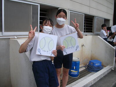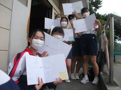 土曜日の葛北大会の団体戦で残念ながら敗退してしまった女子ソフトテニス部ですが、3年生に向けて後輩たちが寄せ書きのプレゼントを渡していました。お世話になった3年生に対し、感謝の気持ちが込められたメッセージがたくさん書かれていたと思いますが、顔を近づけてメッセージをじっくりと読む姿が印象的でした。個人戦で、県大会に出場する3年生の2人は、最後までがんばってほしいと思います。