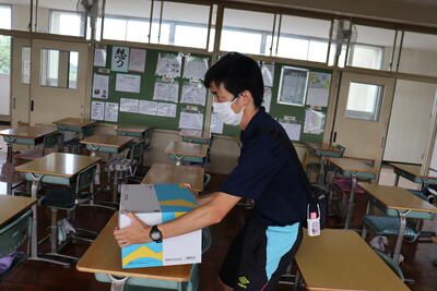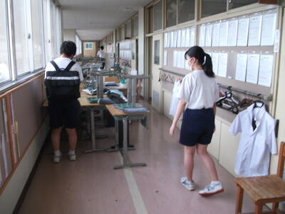 始業式終了後には、各クラスで宿題の回収やそれぞれ指定された場所へ提出をしました。いずれも生徒が中心となって活動しており、2学期早々から子ども達の意欲的な姿が見られ嬉しく思いました。