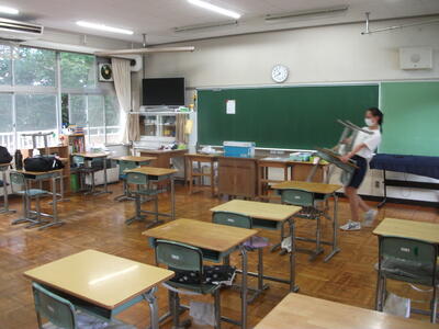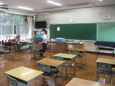 昨日は大掃除があり、机や椅子は廊下にあり、教室の床はワックスでぴかぴかになっていました。今日は朝から登校した子ども達が、廊下にある机と椅子等を教室内に運び、揃えている姿が見られました。自分の分だけでなく、友達の分も自主的に運んでいる姿に感心しました。2学期も、たくさんの自主的な行動が見られることを楽しみにしています。
