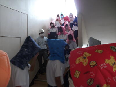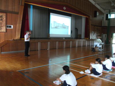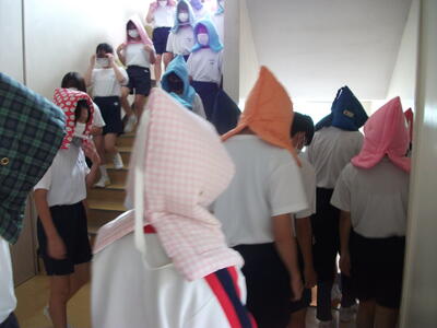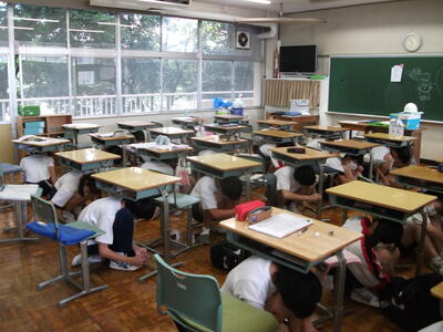 その後、防災の日に合わせ、避難訓練を行いました。一時避難から集中してしっかりと取り組んでいました。3年生の教室からは声や音を出さず真剣に机の下に非難する姿が見ら感心しました。本日は悪天候のため、校庭ではなく体育館へ避難しましたが、避難の際にも「お・は・し・も」を守りながら行動していました。特に、譲り合いながら整然と階段を下りる姿は大変立派でした。地震等の災害が起きた時にも、本日のように冷静に、落ち着いて避難してほしいと思います。