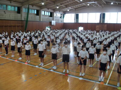 そして、感染対策と熱中症対策をしながら体育館で始業式を行いました。子ども達の背筋をピンと伸ばした姿勢から、2学期に向けてのやる気や意欲の高さを感じました。校長先生からは、新型コロナウイルスの感染状況について、昨年度の同時期と比較しながら、2学期のたくさんの行事を成功させるため、感染対策や熱中症予防に気を付けることの話がありました。引き続き、マスク着用、換気、ソーシャルディスタンス、黙食、手洗いを徹底し、感染症予防に努めてほしいと思います。