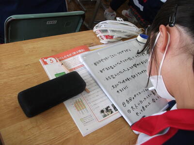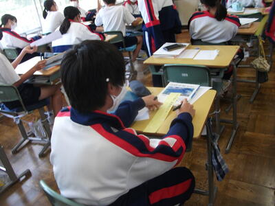 5時間目には、2年生が林間学園のまとめ新聞を作っていました。担任の先生が用意してくれた写真を見たり、しおりやタブレットで振り返ったりしながら集中して作業に取り組んでいました。先輩たちが作った、上手な新聞を参考にしながら、作業を進めている生徒もいました。非常に小さい字で新聞をほぼ完成させた子がいましたが、「これは下書きです」とのこと。下書きの時点から、丁寧な字で新聞を作っている姿が印象的でした。完成版を見るのが楽しみです。