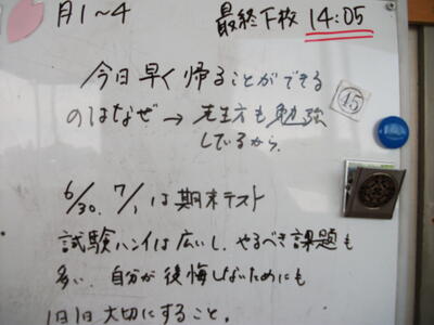 今日は4時間授業の月曜日でした。今日は梅雨の晴れ間で気温が上がり、教室もだいぶ暑くなっていましたが、集中して学習に取り組む様子が見られました。