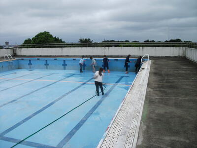今月末から始まる水泳学習に向け、本日はたくさんのボランティアの皆様にお集まりいただき、プール掃除をしていただきました。プールの中だけでなく、プールサイドの壁や手洗い場の排水溝など、子ども達では気づきにくい、細かい部分まで丁寧にきれいにしてくださいました。特に、壁は真っ白になっていてびっくりしました。お忙しい中、本校の子ども達のためにお集まりいただいた保護者や地域の皆様、ありがとうございました。