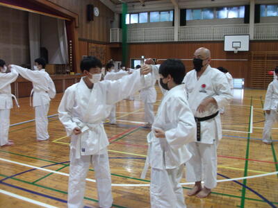 最後の授業は2年生でしたが、池田先生の掛け声や号令なしで、スムーズに、正確に、気合の入った演武をしていました。6時間目でしたが気温が上がらず、肌寒いぐらいの体育館でしたが、子ども達は汗をかきながら動いており、集中し、気持ちを込めた動きに感心しました。さらに、上手に演武を身に付けたので、池田先生から+αで「蹴りの動き」や「相手の攻撃を防ぐ方法」も教えていただきました。普段の授業では、なかなかできない貴重な体験です。ありがとうございました。