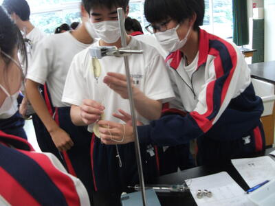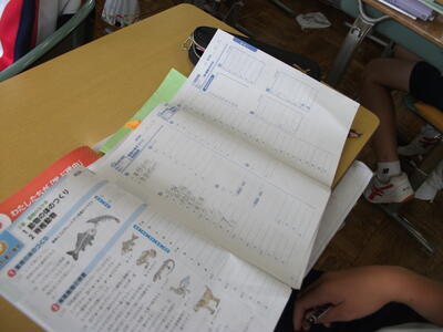 1年生の理科の授業では、無脊椎動物の学習をしていました。机の上には、カエルと一緒にクモやバッタが入った水槽があり、今日も子ども達は実際の生き物を間近で見ながら学習を進めていました。