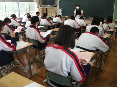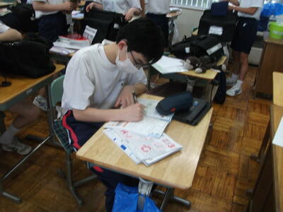 3年生の社会の授業では、第二次世界大戦に関する学習をしていました。最後に、原子爆弾が落とされた都市の一つ、広島市にある原爆資料館の映像を見て、印象に残ったことをプリントにまとめていました。焼け焦げた三輪車の写真に絶句する生徒もいました。今回学習したことを生かし、戦争のない平和な世界を実現する大人になってほしいと思います。