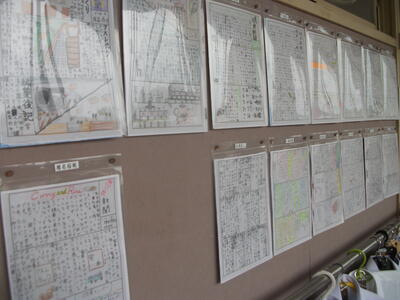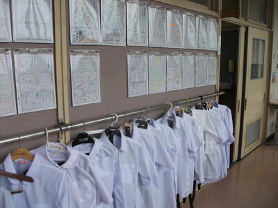 1年生の廊下の様子です。先日、作成していた「校外学習新聞」が完成し、廊下に掲示してありました。どの子ども達も、丁寧に、カラフルに仕上がっており、感心しました。また、掲示物の下に掛けてある制服も、きれいに揃っていて気持ちが良いです。