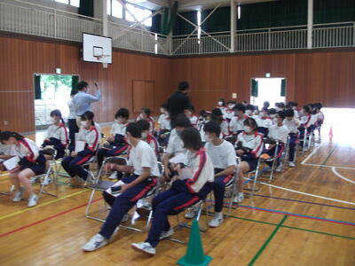 また、体育館に椅子を並べて、新幹線の座席に見立て、乗車練習もしていました。しおりを見ながら、決められた席を自分たちで探し、整然と乗車できるようにイメージして、椅子に座っていました。当日の車内では、大声での会話等は控えることとなっていますが、今日の練習を生かし、スムーズに乗車し、笑顔で、楽しい車内になることを願っています。