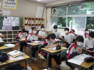 1年生は総合的な学習の時間で、「なぜ学ぶのか」について、学習をしていました。先生の話を聞いたり、子ども達が自由に考えを発表したり、著名人のサクセスストーリーの動画を見たりして、自分が学ぶ意味についてじっくりと考えていました。その後、期末テストに向けて立てた学習計画を改めて見直したり、自習をしたりする姿が見られ、学ぶことに対する意識の高まりを感じ、立派だと思いました。「なぜ学ぶのか」難しい問題かもしれませんが、ご家庭でも話題にしていただけると、子ども達にとっても刺激になるかもしれません。何かの折に話を持ち掛けていただけると幸いです。