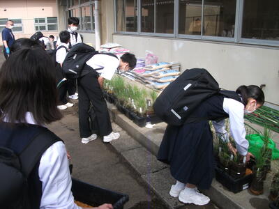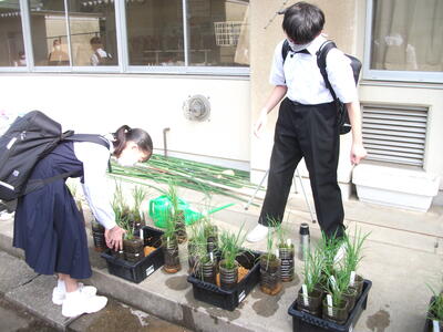 同じぐらいの時間の1年生です。先日もお伝えした「ペットボトル稲」の世話をしていました。今日は、水を替えるようにという指示が出されており、新しい水になった稲がとても嬉しそうでした。1年生のこまめな手入れのおかげで、稲がすくすくと大きく育っています。これからも大切に育ててほしいと思います。