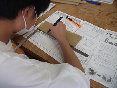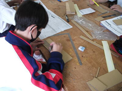 1年生の技術の授業です。段ボールを加工して作品を作っていました。組立図を見ながら「〇cm〇mm」とつぶやきながら細かく寸法を測り、線を引いてカッターで器用に切っていました。廊下には、他のクラスの子ども達の完成した作品も並んでいます。生活に役立つ作品づくりということで、それぞれの子ども達が、自分の家庭のニーズに合わせた作品を選んで作っていました。すべてのクラスの完成した作品を見るのが楽しみです。