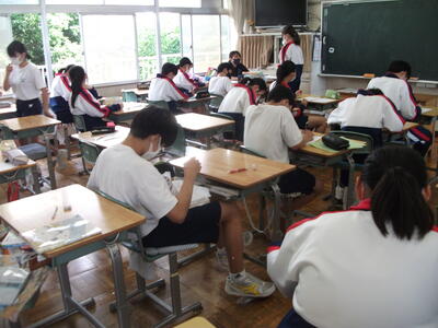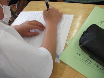6時間目の2年生は、林間学園のまとめの授業です。新聞の清書をしたり、ほっとステイでお世話になった方々に、お礼の手紙を書いたりと、各々が自分の作業を進めていました。新聞はカラフルに、きれいにまとまっており、感心しました。お礼の手紙は、心を込めて、丁寧な字で書いており、感謝の気持ちが伝わってきました。新聞と手紙の完成が楽しみです。