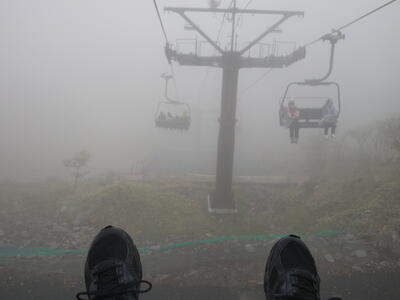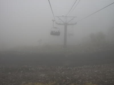 山の上でお弁当を食べ、リフトで下山の際には写真のように雨模様でした。その後、無事にホテルに到着し、到着式を終え、飯盒炊さんと続きます。