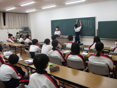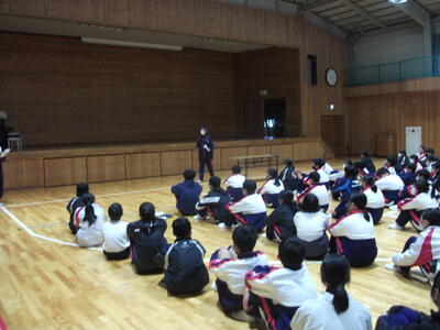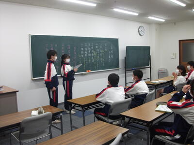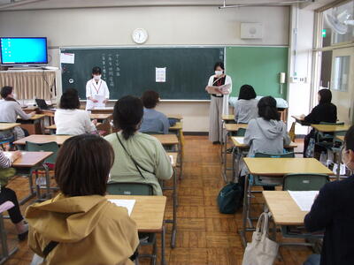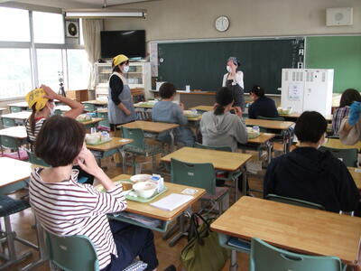 本日は、林間学園に行っている2年生の教室を使って、1・2年生保護者給食試食会を実施しました。土砂降りの雨の中、30名の保護者の方々に来校していただきました。はじめに、本校栄養教諭の飯田から、保護者の皆様に「給食ができるまで」「早寝早起き朝ごはん」について、パワーポイントを使いながら説明をさせていただきました。