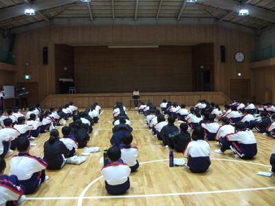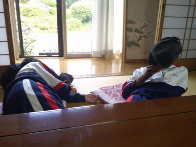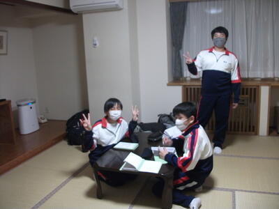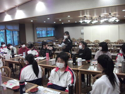美味しいカレーライスを食べた後は、体育館でレク大会です。登山で疲れていることと思いますが、元気に楽しんでいるようです。部屋でひと段落したあとは、各部会での反省です。眠い時間かもしれませんが、しっかりと話し合いをしていました。