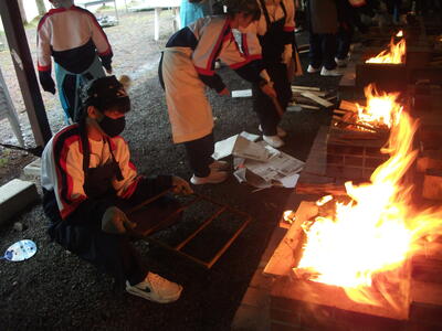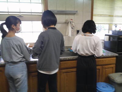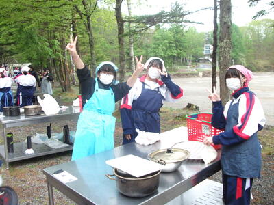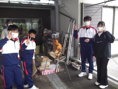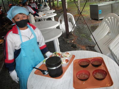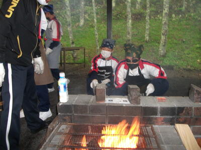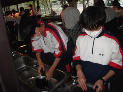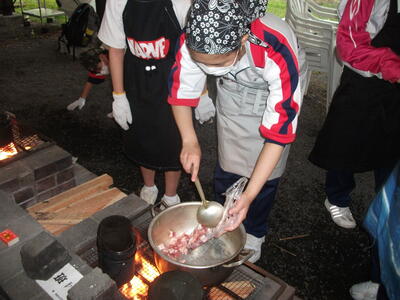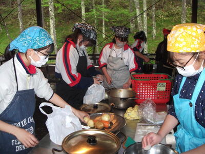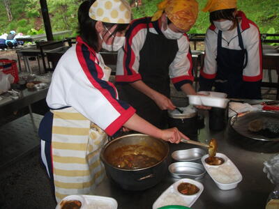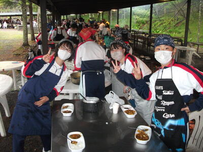 1日目の夕飯は、飯盒炊さんで作ったカレーライスを食べました。あいにくの雨模様でしたが、屋根の下なので予定通り実施できました。火をおこしたり、飯盒でご飯を炊いたり、野菜を切ってカレーを作ったりして、美味しいカレーライスが完成しました。後片付けもしっかりとがんばりました。