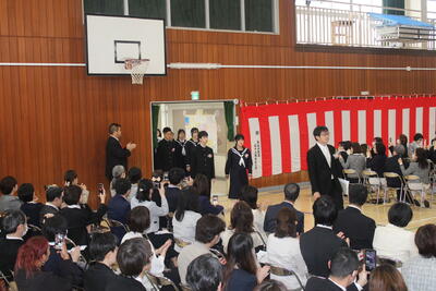 いよいよ歓迎会のスタート!吹奏楽部の演奏で新入生入場ハートその後は生徒会本部の軽妙な進行で、一気に会場は盛り上がりましたお祝い