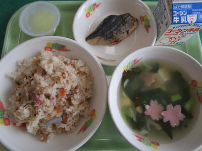 今日のメニューは入学のお祝いと春を感じる「花見寿司」「さわらの西京焼き」「すまし汁」「ゼリー」でした花丸1年生も初めての配膳ながら、テキパキと準備をして、みんなで楽しくいただきました!